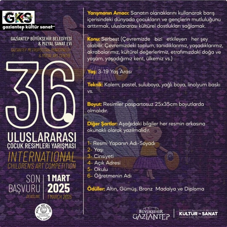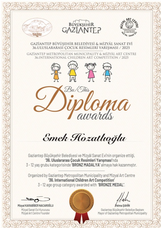 1-F Sınıfı Öğrencilerimizden Emek HOZATLIOĞLU 36. Uluslararası Çocuk Resimleri Yarışmasında bronz madalya almaya hak kazanmıştır. Öğrencimizin kendisi başta olmak üzere emeği geçen herkesi tebrik eder, başarılarının devamını dileriz.
